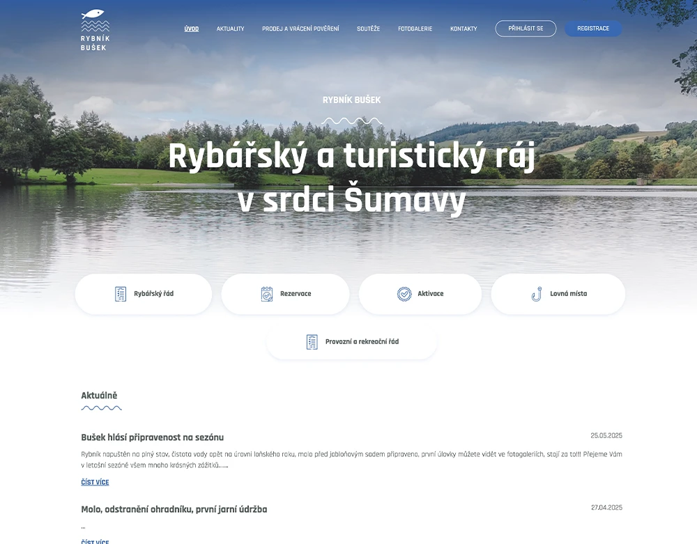 Webové stránky pro soukromý rybník s informacemi a rezervačním formulářem pro nákup pověření k lovu ryb.